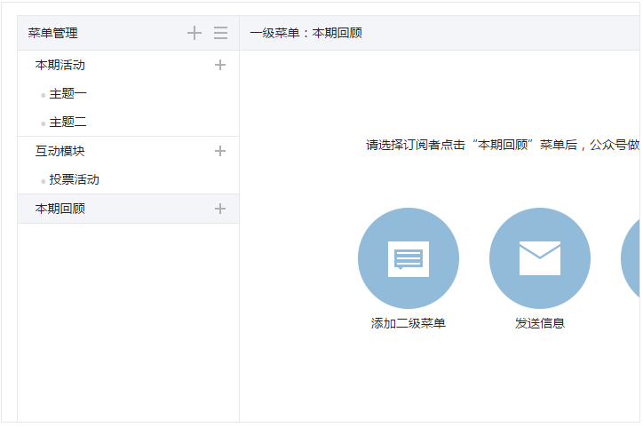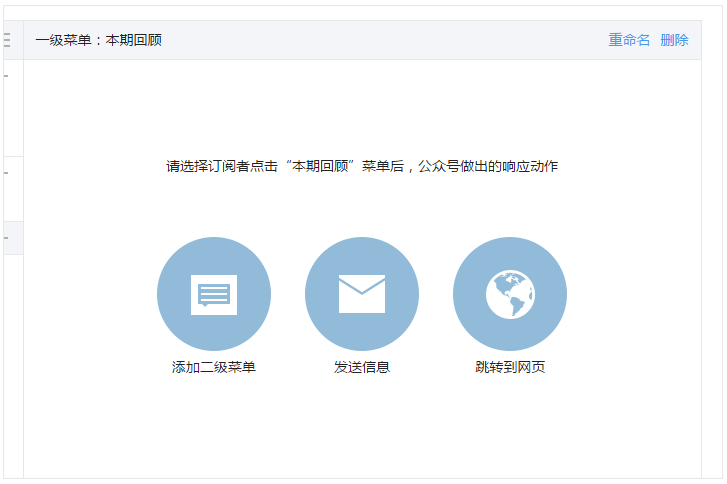 右侧作为菜单的编辑区域: 上方的菜单名称栏区域可进行重命名和删除操作,下方空白区域可编辑该菜单的响应动作,包括添加子菜单、发送消息和跳转到网页三种类型。
