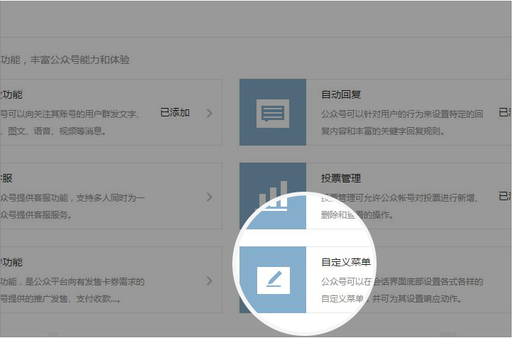 公众平台进一步开放基础能力,对所有的公众号开放自定义菜单功能。 公众帐号运营者点击“添加功能插件”后选择右下角的“自定义菜单”卡片可申请开通自定义菜单插件。