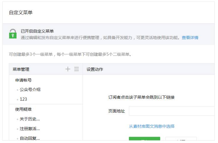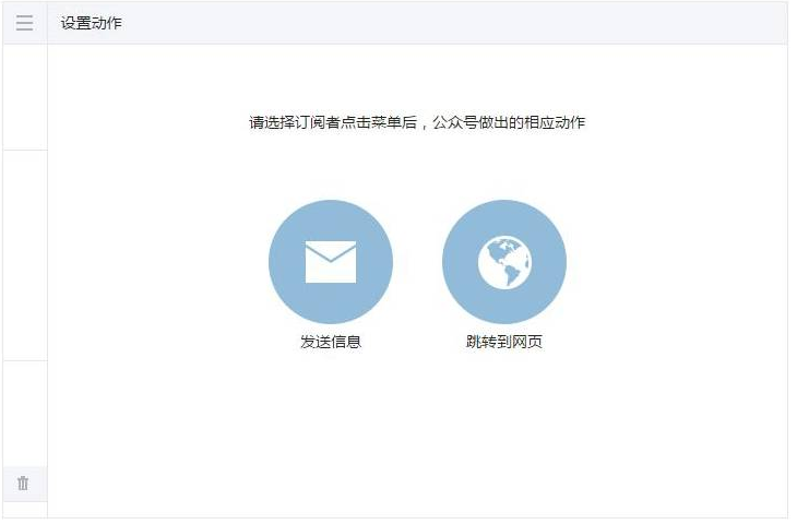 编辑自定义菜单功能时可选择“跳转到网页”和“发送消息”两种动作。