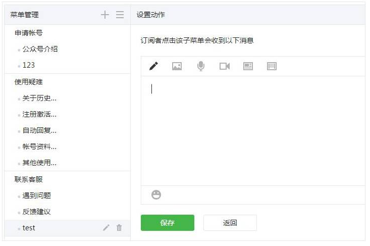 2. 自定义菜单还支持“发送信息”。可发送信息类型包括文字、图片、语音、视频和图文消息等。